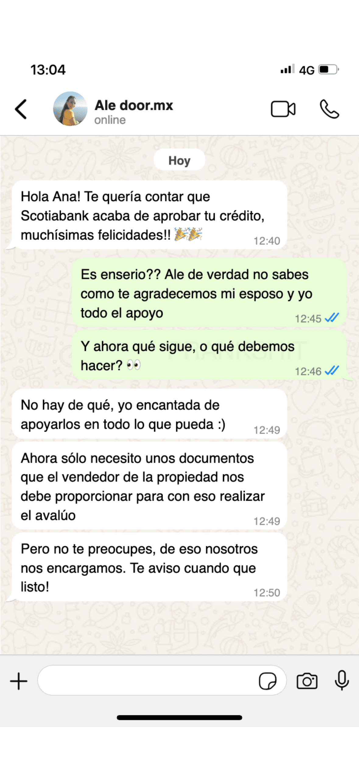 "El equipo de Door fue super paciente conmigo. Me costó entender todas las cosas que se requerían para aprobar mi crédito pero con su apoyo entendí todo y el proceso se completó sin ningún problema."