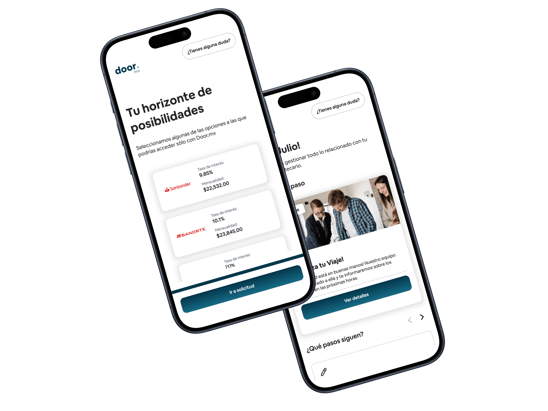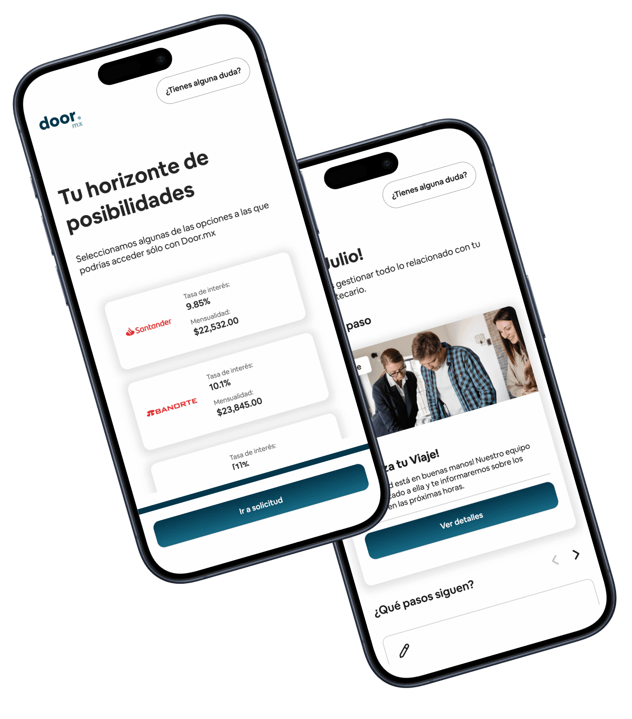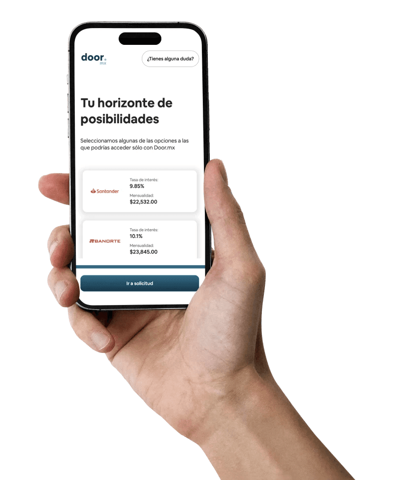 En Door te liberamos de las complicaciones de tramitar un crédito hipotecario. Con nuestras alianzas con los mejores bancos, encontramos la mejor oferta para ti y nos encargamos de todo el proceso 100% gratis.